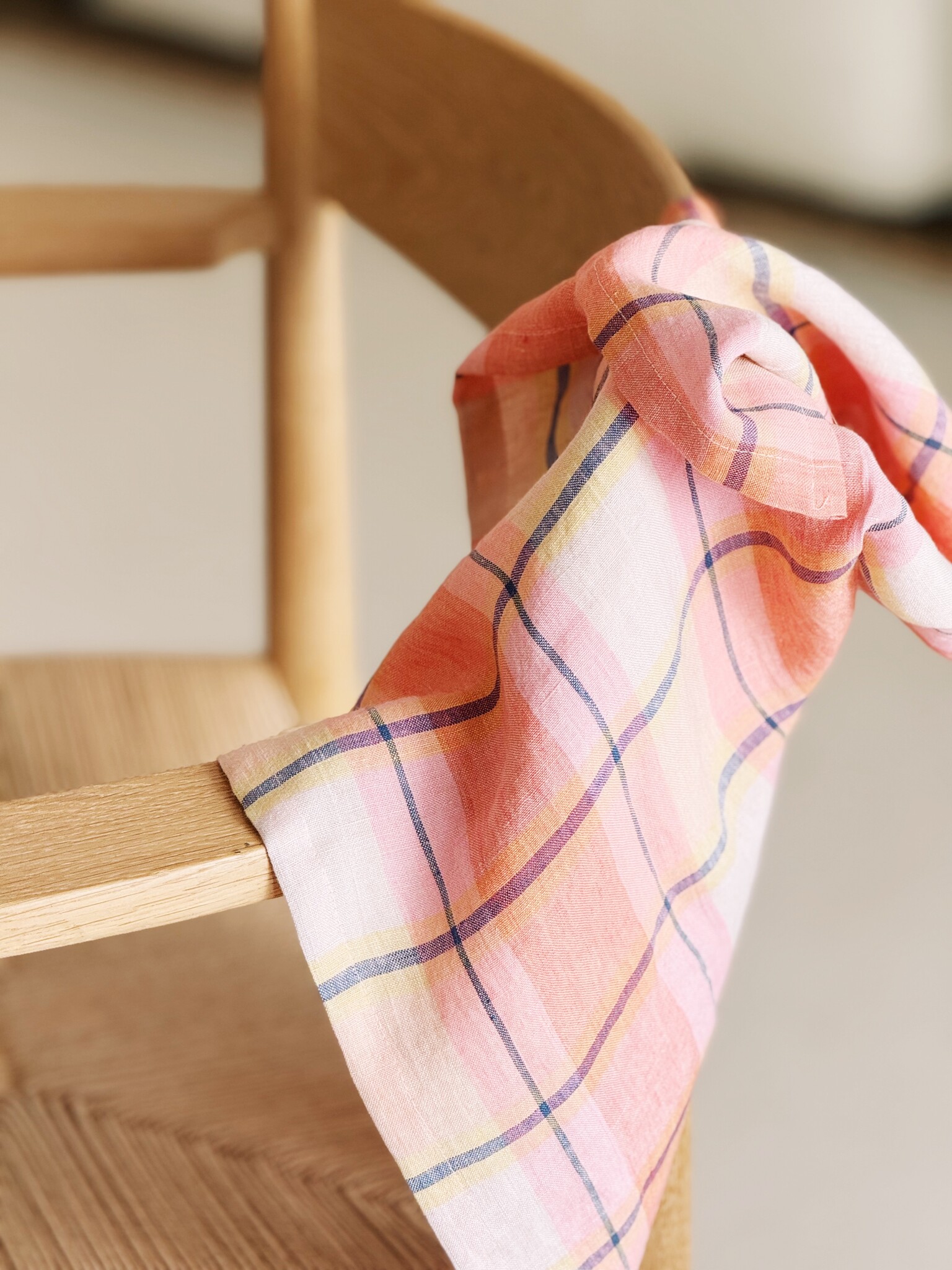 Linen dishtowel in pink, yellow and navy check in size 60 x 70 cm with hanging loop.